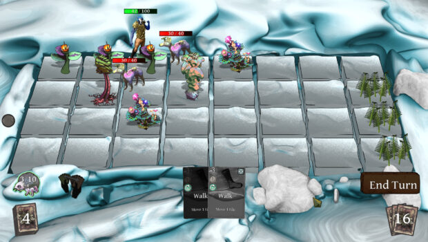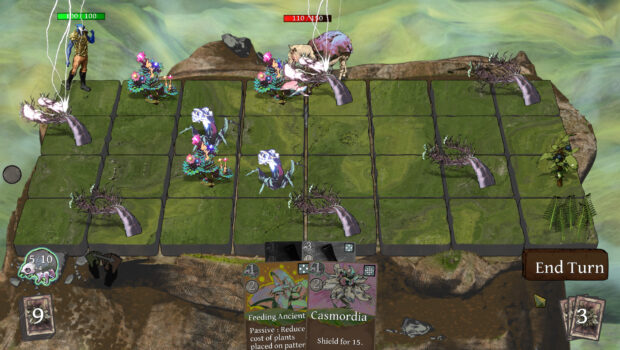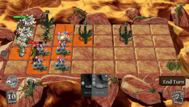 In battles, your cards, representing plant seeds, can be sown on the game grid in order to attack, block or apply effects on enemies, other plants, the grid or the player. The combat system uses two "hands" containing different types of cards: one is used to sow plants while the other allows the character to act directly (e.g. walk, use a tool). The sowing hand is drawn at random from your deck while the action hand is predetermined and recurring. In Botanical Warden, the systems of artificial selection (plant evolution) and hybridization (plant crossing), inspired by botany, allow the player to have more freedom and control in their deck building. Within a fight, the use of both hands creates the emergence of complex strategies.