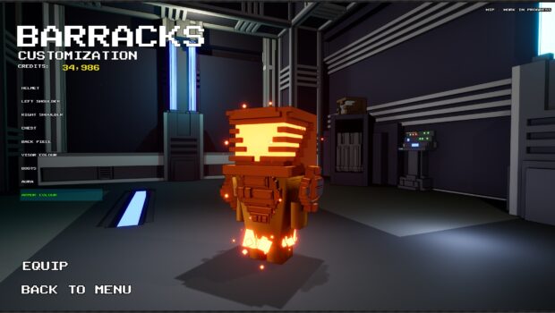 Cube Crusaders is a 3D-sidescrolling metroidvania, with gameplay designed to be well paced. It has moments of fast-paced combat and intensity, as well as moments of deep exploration and challenging, but fair platforming which rewards the player for being clever and using the tools at hand to their advantage. Using various weapons such as Freezerays, Gatling Guns, Sniper Rifles and more, the player has a wide range of fun weapons at their disposal for engaging their foes.Cube Crusaders also features a fairly robust customization system, inspired by the likes of Halo. The player is able to customize their Helmet, visor, shoulders, boots, back pieces, colour, chest pieces, as well as their 'Aura', which is a elemental themed particle effect to give the player some extra 'je ne sais quoi'.