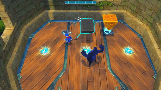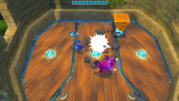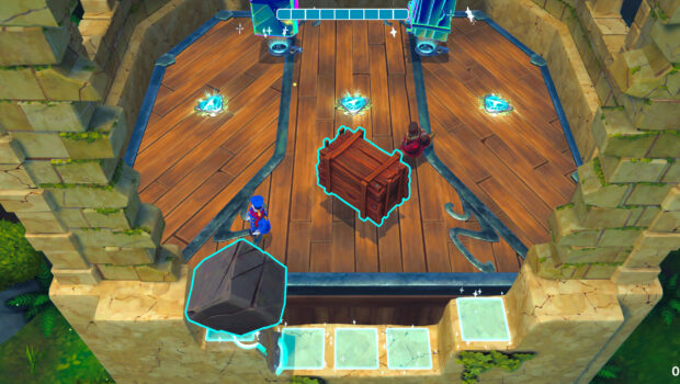 Periodically, enemies appear on the tower and must be dealt with before they destroy the heart-shaped light cores, the magical devices fueling our generators. The enemies can be picked up and thrown off the tower, but the blocks can also serve as improvised weapons against them. With the blocks, players can damage and stun the enemies, making them easier to throw off the tower or bringing them closer to destruction. Their magic staff can also be used as a low-damaging weapon to hit enemies. The enemies appear in waves, akin to a Tower Defense, and become progressively more numerous and dangerous. The players will face various types of enemies boasting different capabilities and even special powers in some cases.