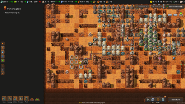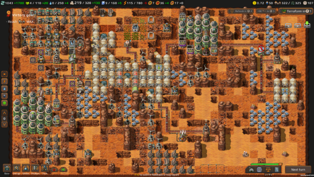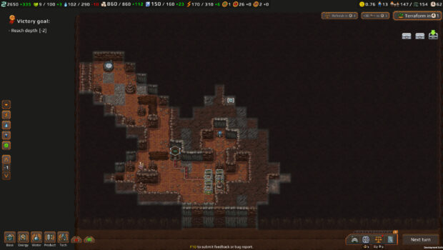 Use a turn and select a terraforming kit to shape the landscape to your colony’s advantage. Need a water source? Place a water drop tile into a canyon and watch the surrounding flat land become fertile. Need suitable terrain to build wind turbines? Use a terraforming kit to raise mountains that will help increase your energy production.