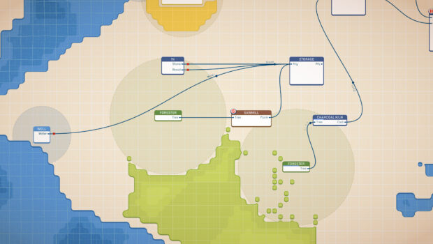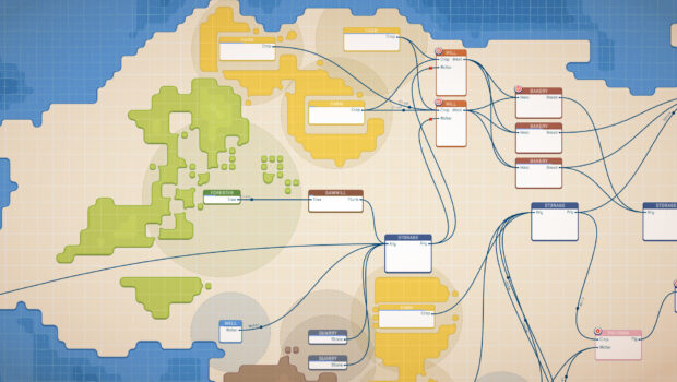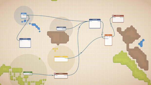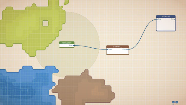 Masterplan Tycoon - a fusion of tycoon gameplay with the visual concept of nodes. Nodes are buildings. Pins are warehouses. Links - roads between buildings. And dots - transfer resources from one building to another.