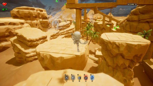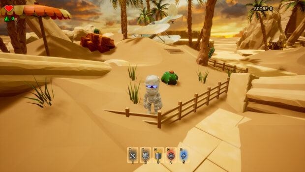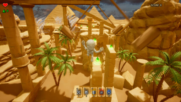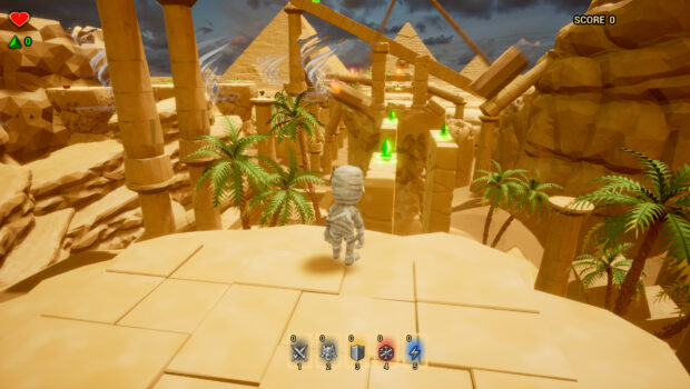 The little mummy Mimu woke up because her tomb was plundered and all the treasures were stolen, so that she would have to return to the afterlife again and collect them all.The player character has a normal and enhanced attack, a defensive skill that heals and increases movement speed. The basis of the gameplay is overcoming various kinds of obstacles, in the form of cliffs, fires, presses and enemy NPCs. Procedural generation is used to form the levels, the higher the level, the more base platforms it contains, on the last platform there will be one of the tomb robbers, after the victory one of the stolen treasures will be obtained. Game resources can be collected at the level or obtained from destructible objects such as barrels, jugs, chests, cacti.