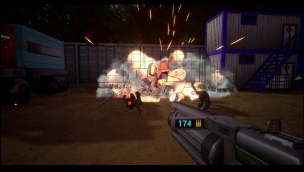 A variety of locations and game scenarios - first you are shooting soldiers from 3 guns at the same time, and then the floor becomes lava and a huge duck burns you with a laser from its eyes
