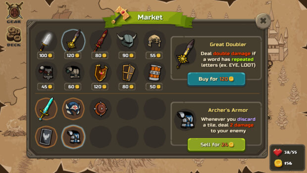 Your primary goal in Words Can Kill is to defeat the final boss at the end of the run and eventually save the princess. You travel through the fantasy world, trying to upgrade your deck and find a better gear along the way. Here your deck consists of letter tiles akin to those in Scrabble. This adds a neat dimension to which letters you add to the deck or take away, because it completely changes what words you can play in which situations.During combat you build words using letter tiles you draw from the deck. Each word acts as either defense or offence and you have the control. To be successful you need carefully plan your future turns. You can leave some letters in your hand, discard them, or place them on the board for future.