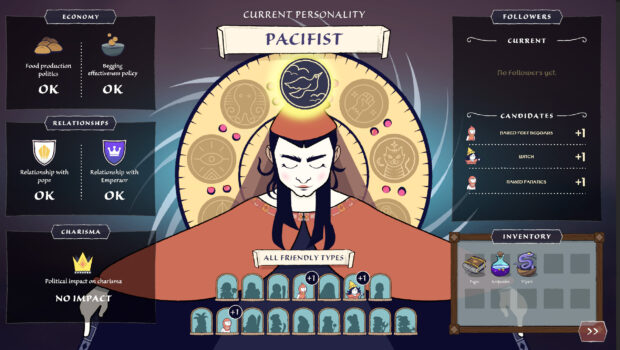 The tricky part of the plan is that there is a set of main personal traits that the character will evolve into in function of choices and conquest state: towards sanctity, charismatic democrat, cult leader, evil queen, focused on ecclesiastic power, or compromising for a larger realm.