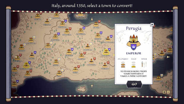 The game loops around conversion “battles”, where you have to pick a fitting set of units required, deploy them within the chosen town, and then the confrontation begins: you can change units’ actions and there are fights and conversions on the spot (an evolved rock paper scissors mechanic).