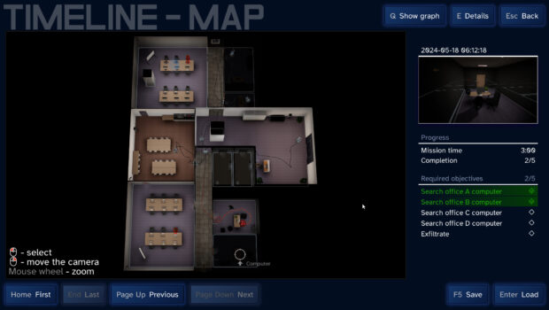 To facilitate experimentation, the software includes the "Timeline" feature - a way to quickly create and restore save points at any time, allowing different approaches to be attempted for the entire duration of the mission. Save points can be arranged in a map, or in a progress graph, which allows them to be identified more easily.