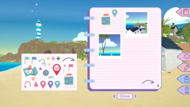 A key drive for us when developing the game was to focus on player expression. As players explore the island using their trusty metal detector, they will find many types of items hidden underground. Players can take these items to Cenna’s shop, exchange them for credits and purchase new sticker packs and film for their instant camera. The player can then decorate their journal with these stickers and the photos they have taken. Every single player will feel uniquely connected to how they have chosen to decorate their journal. Players can express themselves in the form of the in-game journal.