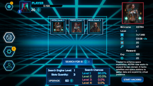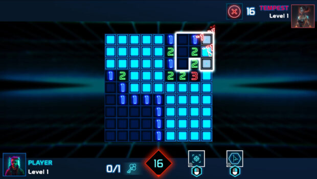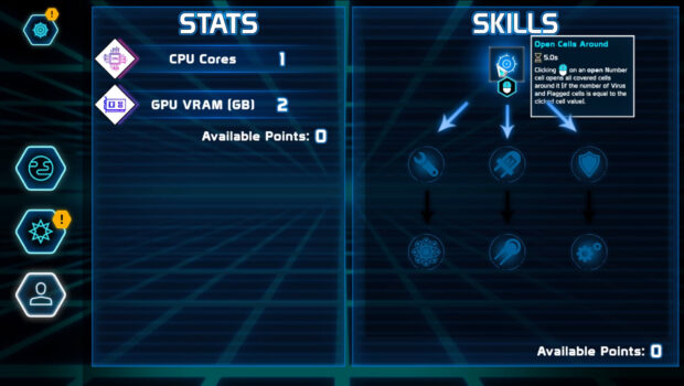 The gameplay follows the rules of the "Minesweeper" game, but does not stop the game when a player opens a "mine", it only imposes a time penalty. Since the goal is to complete a task within a certain time (usually finding "keys"), and not just to open all the cells, it makes the game more dynamic, forcing the player to take risks, and challenges the players' quick decision-making skills.RPG elements create progression and allow you to customize the game to your style - the player can improve both the effectiveness of certain skills and reduce the penalties for using them. In addition, with more unlocked skills and found items, the player can create "module" elements directly on the hacker board, which will give additional bonuses and effects.