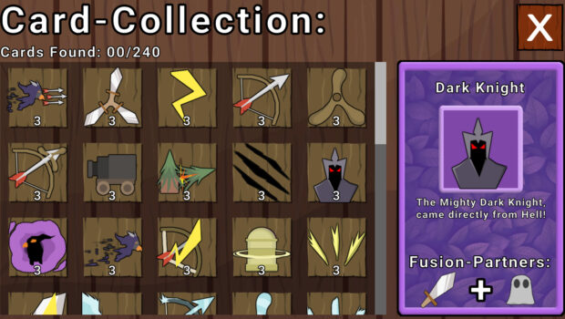 You collect & manage a Deck of 7 weapon-cards to defeat your enemies. Each Character has his own unique starter weapon and you collect 6 more weapons in the Dungeon. You can also merge any of your weapons to create new and better ones. There are over 200 weapons in total to explore.