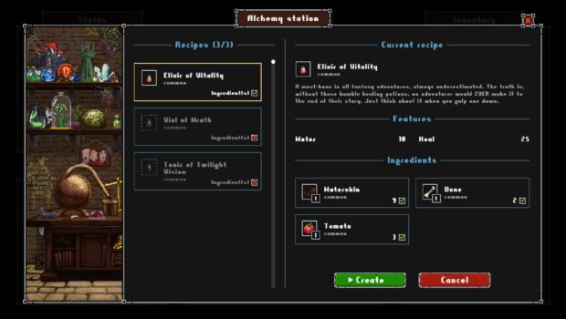 Rage, like health, can also be replenished with potions. Potions can be found or crafted. The game features three crafting stations: a kitchen for cooking meals, an alchemical lab for concocting potions, and a forge for creating equipment.