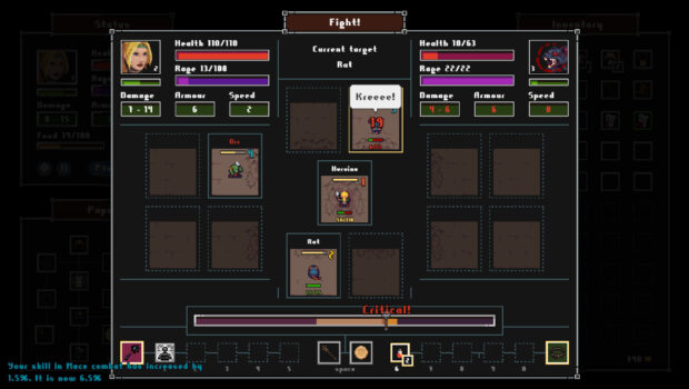 The hero and enemies are positioned on the battlefield, alternating turns based on their initiative scales. When the hero's initiative is full, he or she can attack the chosen enemy. Players must stop the weapon's moving icon in the hit zone — either normal or critical — to execute a successful attack. Similarly, blocking an enemy's physical attack requires selecting the aggressor and timing the stop of the shield icon over the attacker's weapon icon precisely.