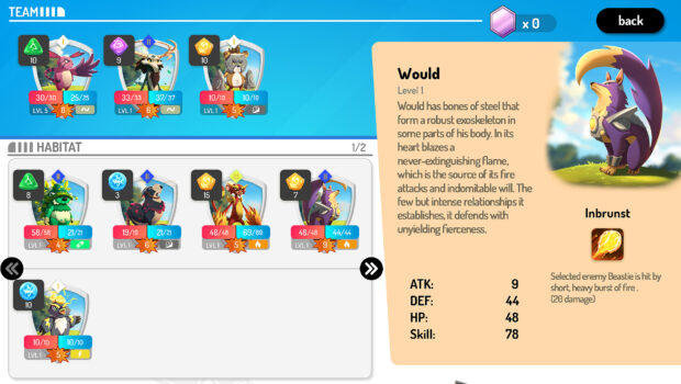 Our friends, the Beasties, receive primordial dust plates as loot after winning battles. With them, you'll improve their abilities. In this way, you can upgrade each Beastie individually by investing in health, defense, strength, and special abilities. You decide how to set up your team based on your strategy!