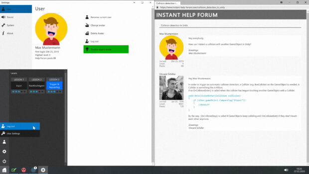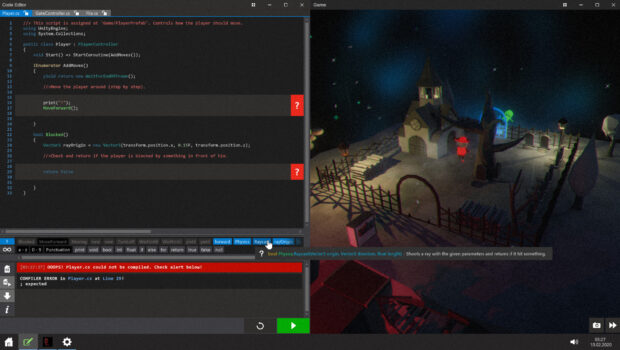 The features include an implemented runtime compiler, which makes it possible to execute the code written by the player within the runtime of the application and, thus, instantly influence the game world. This code is highlighted in different colors with syntax highlighting and compared with an allowlist before execution. Errors during execution are displayed in comprehensible console output. If at some point the player cannot find the solution without help, it is possible to use the 'Instant Help Forum' within the application to get immediate help on questions. When the player completes a level, he has the option to view the decrypted files and play a new level which appears in the Windows-like start menu.