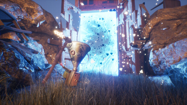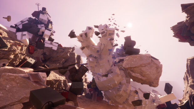 For our second island, all our creatures are moving on customly placed splines. Like before we were aiming for that same uncanny feeling but it had to fit the different setting. Going with the theme of a junkyard full of abandoned appliances, it was an obvious choice to have flying toasters up in the air above the canyon. Like with the player character we were aiming for an assembled-like design, which led to the decision to give the toaster brooms instead of wings and lightbulbs for eyes. Similarly to the first level, Mo has to repair one of these toaster-birds to be able to continue on through the next portal.