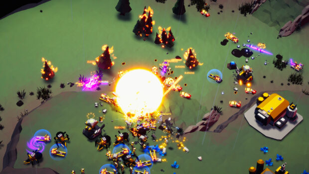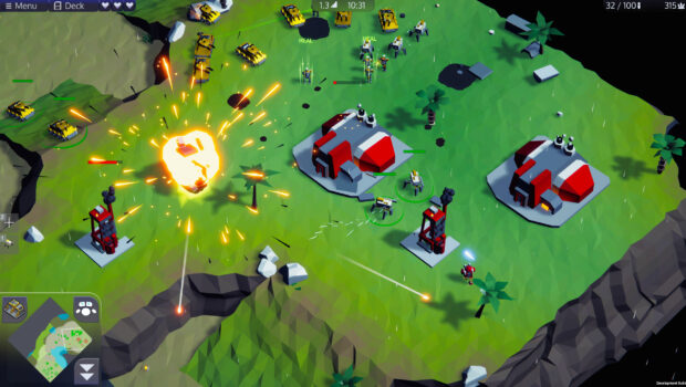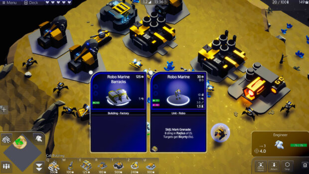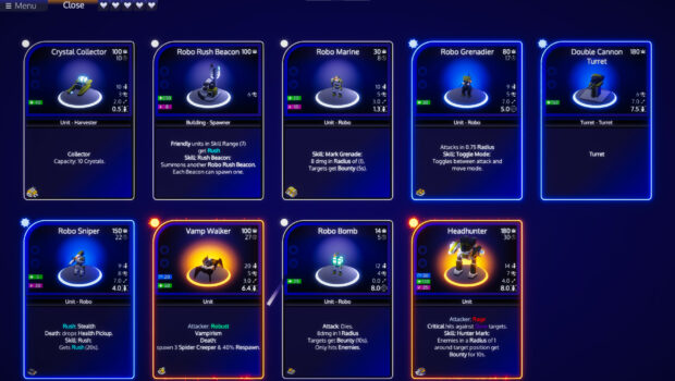 Instead of learning build orders by heart, each run of the game opens new ways of play. After every level you choose between new blueprint cards that add a new building to your arsenal, like factories, support buildings, turrets or super weapons. You can upgrade your units and buildings or apply global modifiers that add new abilities. Choose wisely to create powerful synergies and combos that allow you to outsmart the overwhelming force of the enemy hordes. Utilize the nano-darkness of robo-necromancy to swarm your foes or set the maps ablaze with fiery chain reactions consuming forests and opposition alike.