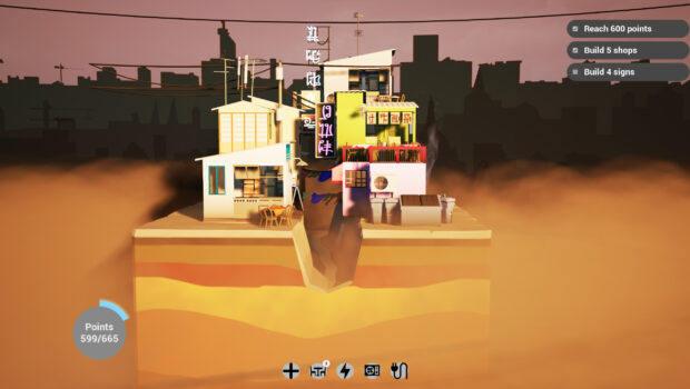 In ShantyTown you decide where objects need to go to please your aesthetic organization and based on what adjacency bonuses will earn you points. Every object has unique placement requirements, and can earn or lose additional points by being nearby other specific objects. After filling a threshold of points, you'll get the option to pick from 3 packs of objects ranging from house blocks, electric signs, shop fronts, to plants, trash, rooftop accessories and more.Each map has 3 objectives to complete, and once completed, the progress you've made will unlock new objects, packs and visuals as well as new maps to play on (unlocks not implemented yet).