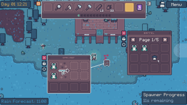 - Find and collect different mushrooms to help buff (or debuff) your frogs